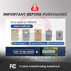 **Compatible list**: ONLY Compatible with 300MHZ 10 Dip Switch Multi Code Gate Opener Remote 3089 MCS308911,3060 MCS306010,3070 MCS307010. **24 Hours Customer Support & 3-Year-Warranty**: Enjoy unparalleled peace of mind with our **garage door remote**, backed by 24 Hours Amazon customer support and an extended warranty, ensuring top-notch service and reliability. **Durable & FCC Certified Design**: Built to last with an ABS alloy casing, our **smart garage remote** has passed over 100,000 rigorous validation tests and is fully FCC certified, guaranteeing ultimate reliability and safety. **Long-Lasting Battery Life**: Powered by a 12V 23A large-capacity battery and a third-generation intelligent low-power chip, this **long-lasting garage door remote** offers superior compatibility with various garage door motors. **Enhanced Security Technology**: Featuring advanced 300MHZ Fixed Code technology, our **garage door opener remote** provides enhanced security and anti-theft protection, giving you peace of mind that your garage is secure. **User-Friendly & Long-Range Control**: With an impressive 164ft control range, this compact **garage remote** can be effortlessly paired with your garage door motor and conveniently stored on your car’s sun visor for easy access.