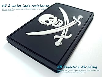 FEATURES: Set of 2 Jack Rackham patches with hook-fastener backing per pack. 3.15 x 1.97 inch/8 x 5cm in flag size. the right size allows it to be sewn into any garment. VIVID COLOR and DURABILITY: UV and water fade resistance emblem makes the color lasting as new as intact. Our pirate patch features hook and loop fasteners backings that can be sewn to any hats, backpacks and uniform and easy to remove, wash or replace other types. EXQUISITE WORKMANSHIP: Laser cutting makes loop side the same size as rubber tactical patch. The tactical patches are made from premium PVC and advanced injection molding process makes it has a strong 3D sense with full color pattern, soft, durable, lines of clear and neat designs. Soft rubber allows it to bend freely without deformation. APPLICATIONS: Perfect decorations for military uniform, tactical bag, jacket, team caps, backpacks, tactical hats, etc. It's a great way to decorate your garment and add a simple patriotic touch to your belongings.
