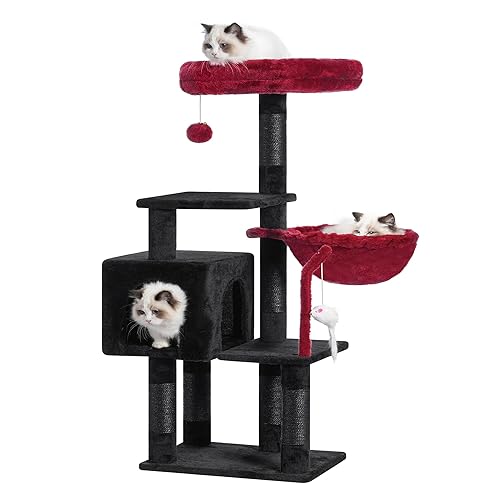 MORE THAN JUST A CAT TREE: The hallway, living room, or play room will be a perfect place for this cat tree. We have different colors for you to choose from. With easy-to-match color and an interesting layout, this cat tree will be a special decoration in your room QUALITY MATERIALS: The cat tower is constructed of CARB P2-compliant particleboard, plush, sisal ropes, paper tube, plastic, and iron. It is covered by comfy plush which aims to provide your cat with extra comfort. The whole structure is stable and strong enough for cat jumping and playing DOUBLE STABILITY: Safety and stability of the cat tree are important, especially when the cat is jumping and playing, therefore, we add an anti-toppling kit to the middle board. You can secure the cat stand to the wall for double safety THOUGHTFUL DESIGN: The hammock has four lengths of strings and four hooks in the corners, which is convenient for fitting on and removing. The dangling ball is detachable. Besides, all corners of the extended platform are round in shape, to avoid hurting INTERESTING LAYOUTS: Ample room and reasonable layout ensure your cat a comfortable and interesting experience. Your cute cat can hide in the condo, sleep on the lower hammock, and enjoy the scenery on the top perch. The scratching posts, a ladder, a hanging ball, and rope will bring him/her more fun