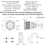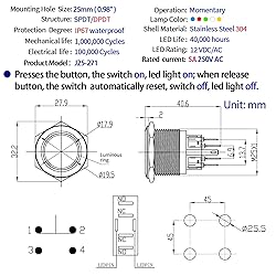 - Package include : 1* Push Button Switch 1* Wire Connector Sockets 4* separate wires What's Momentary Switch: Momentary switch, Push & Hold, ON; Release, OFF What's the Wire Connector: With the wire connector, you don't need to solder the terminals, make installing very easy Saves the issue of soldering to the switch, and possibly melting it as well You can replace the switch anytime by just unplugging the switch from its socket What's Momentary Switch Used for: Great for electromagnetic starter, relay, Doorbell, Horn Button Switch, PC Power Switch or any circuit controls What's Note: -These switches come with a rubber O-ring which makes them splash resistant but they can NOT be submerged underwater -The project you are going to be used for, don't let current go above 5 amps. Or the switch will get warm and to be burned out What's Customer Support: If you have any questions, feel free to contact us by E-mail any time. We get professional customer service staff and technician to help you Specifications: Head diameter: (27.9mm) Mounting hole size: 0.98" (25mm) Depth inc contacts: (43.15mm) Switch combination: 2NO 2NC / 1NO1NC Switch rating: 5A/250VAC LED rating: 15mA, AC/DC 12V Head shape: Flat Head material: 316 Stainless Steel Enclosure material: 304 Stainless Steel Protection level: IP67, IK10
