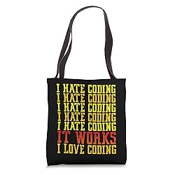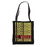 Funny coder IT software developer design that says I Hate Coding It Works I Love Coding. 16” x 16” bag with two 14” long and 1” wide black cotton webbing strap handles. Made of a lightweight, spun polyester canvas-like fabric. All seams and stress points are double-stitched for durability, and the reinforced bottom flattens to fit more items and hold larger objects. Spot clean/dry clean only.