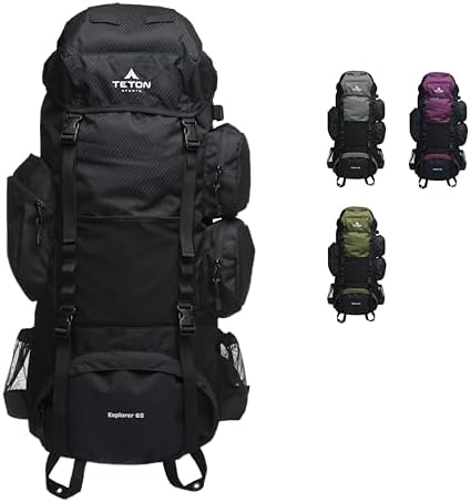 Teton 65L Explorer Internal Frame Backpack for Hiking, Camping, Backpacking, Rain Cover Included, Black