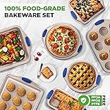 10-PIECE SET: The 10-Piece Baking Pan Set offers complete high quality kitchenware for baking cake, loaf or muffins. Includes baking pan, pizza pan, small/big cookie sheet, 2 round pans, square pan, loaf pan, and 12-cup & 24-cup muffin pans NON-STICK COATING: Made from durable & BPA-free carbon steel metal & it’s shielded w/ non-stick coating that eliminates the need for butter, oil or cooking spray. Also for quick & effortless food release plus it does not emit any weird odor or smell OVEN SAFE UP TO 450 °F: Heat-safe even at high temperatures of up to 450°F which is ideal for baking a number of tasty baked goods or pastry. Create the most delicious chocolate fudge, cookies, cupcake, apple pie, brownies, birthday cake, and more HEATPROOF SILICONE HANDLES: The commercial grade restaurant quality kitchen bakeware features blue silicone handles to prevent accidental burns. Also stain-resistant, easy to clean & dishwasher safe but hand washing is recommended to extend pan life STACKABLE DESIGN: The reusable professional non stick baking set molds feature a space-saving stackable wide tray pan design for convenient storage. It is fully compatible w/ standard & convection ovens. Suitable for oven, refrigerator & freezer