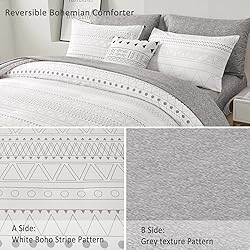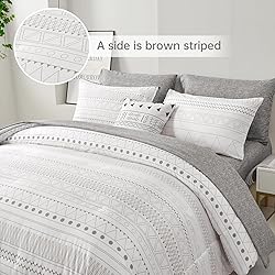 【7 PIECES BED IN A BAG】: This Grey boho king size comforter set include 7 pieces. 1 comforter 90" x 103" + 2 pillowcases 36" x 20"+1 Fitted Sheet 78"x 80"x14“+1 Flat Sheet 102x 108"+2 Pillow Shams 20"x 40".NOTE: No Pillow Insert Includes. 【UNIQUE REVERSIBLE BOHO STRIPE DESIGN】: This boho bed in a bag comforter set is simple and fashionable bohemian style, A side is white background with brown stripes, B side is grey texture pattern. 【ULTRA SOFT MICROFIBER MATERIAL】: This boho bed in a bag comforter set is crafted from ultra soft microfiber material, with the comforter filled with a whole piece of microfiber. The firm stitching and exquisite hemming ensure high tensile strength, wrinkle-resistance, fade-resistance, and machine washability for the solid microfiber comforter. With its moderate thickness, this comforter set is suitable for all seasons. 【EASY TO CARE】: 100% Polyester microfiber easy care & machine washable,never fade, wrinkle free, resistant to dust, easy to remove pets' fur. Our Comforter can be used directly without duvet cover,more convenient to use. 【WARM TIPS】: As the grey boho stripe comforter set is packed in vacuum bags, it is recommended that you dry the quilt in the sun and gently tap the quilt to make it fluffy again. If you have any questions, please contact us.