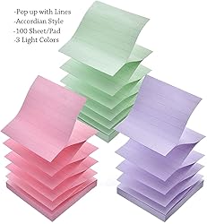 Pop up with lines:Accordion style sticky notes for dispensers, The lines on the sticky notes can make writing neater and last longer. Portable Size:3 x 3 inches, 6 Pads/Pack, 100 Sheets/Pad, 600 sheets in total,easy to carry and store. High Quality: High quality paper, easy to use and peel, no residue, can keep clean and tidy, put notes on a computer monitor, binder, etc. Light Color: Green, Rose red, Purple colors ,get noticed easily. Widely Use: Use for remind yourself or others, visualize your calendar and to-do, organize your projects, plan your work and brainstorm ideas.