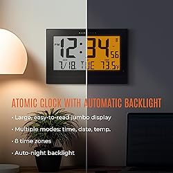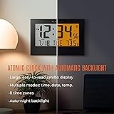 MARATHON Atomic Wall Clock with Automatic Backlight, Black - Large 10-Inch Display - AM/PM or 24-Hour Time, 8 Time Zones, Indoor Temperature, Day & Date - Includes Wall Plug