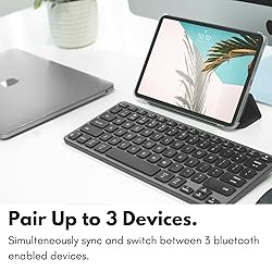 Backlit for Any Situation: It's nice to actually see the keys while we type. That's why our wireless backlit keyboard has crisp white LEDs that offer 3 brightness levels. Small and Versatile: Save desk space or take it on the go. Our small bluetooth keyboard for Mac /PC/iOS/Android is universally compatible and fits in your bag at only 11.2 in x 4.6 in. Pair 3 Devices Simultaneously: This multi device keyboard allows you to pair and switch between 3 bluetooth devices like your laptop, smartphone, tablet, or tv on the fly. 30ft wireless range. Simply Recharge and Go: Our mac bluetooth keyboard backlit is equipped with a 800 mAh rechargeable battery and On/Off switch. USB-C charging cable included. Enhance Productivity and Aesthetics: If you're an Apple user our bluetooth wireless keyboard for mac is the perfect solution. It offers sleek aesthetics and seamless integration with iPad, iPhone, and the Mac ecosystem.