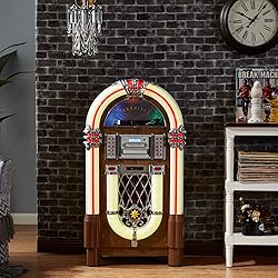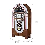- Design: Bring the retro charm of a 1950's American diner right into your home with this beautifully designed jukebox. Versatile: This jukebox has a belt driven player with auto-stop function, a USB port, MP3-compatible CD player, and a SD slot for music playback and recording function. A Bluetooth interface also allows for music playback from a smartphone, tablet or laptop. Infinite possibilities: Whether your music is old or new this jukebox offers various possibilities to make your day more musical. A large number of playback options to choose from allow for you to listen to your whole music catalogue. Versatile: This jukebox has a belt driven record player with auto-stop function, a USB port, MP3-compatible CD player, and a SD slot for music playback and recording function. A Bluetooth interface also allows for music playback from a smartphone, tablet or laptop. Memory: The jukebox also comes with a FM radio that has memory storage for up to 20 stations. There is also an AUX input for wired audio devices and line output for signal transmission. Infinite possibilities: Whether your music is old or new this jukebox offers various possibilities to make your day more musical. A large number of playback options to choose from allow for you to listen to your whole music catalogue. Design: Bring the retro charm of a 1950's American diner right into your home with this beautifully designed jukebox. Connected: 1 x USB port, 1 x SD memory card slot, 1 x 3.5mm jack AUX input, 1 x stereoRCA line output | RCA line output | Bluetooth version: 4.0