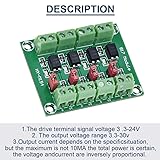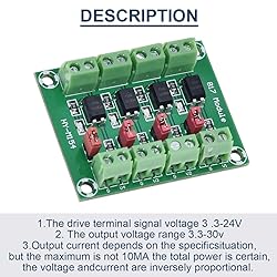 - Specification: 1. Driving Terminal Port Signal Voltage:3.3 to 24V 2. Output Port Voltage Port:3.3 to 30V 3. Output current depends on the specificsituation, but the maximum is not 10mA the total power is certain, the voltage andcurrent are inversely proportional 4. Through the jumper cap can achieve whether the output is high potential outputor low output 5. Onboard 4 to Channel 817 are Independent, which can achieve different voltage control at the same time Note: If it is pulse signal, please note that the limit of 817 is below 3Khz. If the controlsignal is greater than 3Khz, please do not use this module, it will not work properly Application: The output level of the single chip microcomputer is low, and the driving voltage of the driven module is high, for level matching, for example, some PLC inputshould have 24V voltage and can be converted by this module. Package Included: 2 x PC817 4 Channel Optocoupler Isolation Board 1 x 24AWG Wire