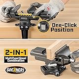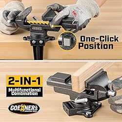 2-in-1 Multifunctional: This bench vise can not only be screwed tightly to the workbench, but also clamped on a bench or table. Compact but sturdy. A must-have tool for use in home benches and small workshops 360° Swivel: The 360-degree swivel vise base allows you to turn in any angles, perfect for multi-angle tasks. Smooth rails make tightening and operation a breeze One-Click Positioning: Simple one-click precise clamping. Press the button to pull the jaws together to locate and hold firmly in place. No need for hassle screw positioning Wide Range of Application: Jaw opening up to 2.5", jaw width is 3.3". The base clamp supports clamping on tables with thickness up to 4". This size is designed for a wide variety of projects - woodworking, drilling, cutting conduit, gluing, metalworking, sanding and sawing and most DIY tasks Built to Last: The vise is made of high grade cast steel for overall durability. The jaws are specially hardened and engraved with a non-slip texture for excellent grip, allowing you to rest easy and focus on your projects
