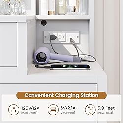 - Tiptiper Makeup Vanity with Light Mirror and Power Strip Elegant & Sturdy & Worthwhile Are you looking for an attractive and practical make up vanity? This dressing table with lighted mirror is a stylish and functional modern piece of furniture that will add glamour to your room and fulfill your princess dreams. It's a great gift choice on a birthday, Christmas, or other meaningful anniversary! This dreamy vanity desk will make whoever receives it be all smiles! So please don't hesitate. Let this vanity set bring you a wonderful makeup experience! Features: 1.Vanity with Charging Station: The power strip with 2 USB ports and 2 outlets is more convenient for your life. 2.Adjustable Brightness Tricolor Light Mirror: Warm yellow, warm white, and cool white make it easy to apply makeup in a variety of environmental conditions. 3.Bedside Table Design: Combining a vanity and a nightstand into one does not take up too much space and saves money. Specifications: Color: White Material: Premium E1 Grade Particle Board, Metal, Glass Overall Size: 36.3"L x 15.8"W x 56.5"H Assembly Required: Yes (easy) Package Contents: 1 x Vanity Table 1 x Mirror 10 x Light Bulbs 1 x Power Strip 1 x Accessory Kit 1 x Instructions
