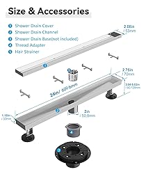 ▶[Material] HTOH shower drain is mainly made of high-quality 304 stainless steel material,sturdy,rust-proof and wear-resistant. The surface of linear shower drain is brushed nickel process, which has stronger corrosion resistance and rust resistance. ▶[Two Decoration] Even though there is only one cap of long shower drain, you can get two decoration schemes. Stainless steel surface or embedded tile insert surface for your choice. The depth of the tile tray is 1/2 inch,and the length is 22.67 inches. Tile insert shower drain truly achieve visual barrier-free and invisible drainage. ▶[Large Displacement] The size of shower pan drain is 24"*2.75"*2.75". Compared with traditional small floor drain,its displacement is larger and water flow speed is up to 60L/min.In addition,the sink of shower liner drain adopts "X"-shaped design, which greatly improves the drainage speed and will not store water. ▶[Easy To Clean] Linear drain cover is removable, and you can use the metal hook to take out the built-in hair strainer. It can prevent hairs from falling into unfathomable sewer for an anti-clogging effect. ▶[Universal Design] Water outlet of shower drain brushed nickel is 2 inch,which fits US NO-HUB drain base system.Large displacement shower floor drain is suitable for drainage in bathrooms,kitchens,garages,basements. ▶[Adjustable Height] The leveling feets of the modern shower drain are adjustable,and the maximum adjustable height is 4-3/32". It can effectively solve the installation problem and prevent the linear shower drain 24 inch from being uneven with the floor level. ▶[24-Hour After-Sales Service] Shower drain kits are complete, including the main body of tile shower drain, adjustable leveling feet, strainer basket, lifting hook, and thread adapter. If you find that any parts you need missing in the shower drain, please don't worry. Contact us at any time, and we will send them to you.