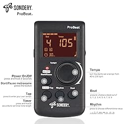 Direct and fast setting of beat, tempo, rhythm by buttons and knobs. Easily reading color screen helps a lot to understand what you want out of your Sondery brand ProBeat digital metronome. Vocal counting option, and 3 types of digital sounds. Big sound out of a speaker. While the LED light on the top gives a clear visual tempo indication and the earphone plug is great for practicing without click or during performance. Easily setting tempo by a rotary dial ranging from 40 to 208bpm. 10 beat patterns including 0, 1, 2, 3, 4, 5, 6, 7, 8, 9. And Sondery ProBeat metronome covers all the needs of different rhythm training. Tap function allows you to enter your own tempo by each 2 taps. Timer function to set practice time length at 15 minutes, 30, 45 and 60 minutes. Sondery digital metronome helps improving your timing in a rich variety of musical styles. Digital metronome is powered by chargeable Li battery inside. Durability of 10 hours use without stop after fully charged in 3 hours. Charge ProBeat metronome from any 5V USB power source.