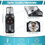 2-in-1 Light Socket Converter: Converts a standard E26 light socket into a grounded 3-prong outlet while retaining a bulb socket, allowing you to power small devices without losing overhead lighting—practical and space-saving Easy Screw-In Installation: Simply screws into existing E26 lamp holders with no wiring or tools required; ideal for quick setup in garages, porches, basements, workshops, and utility areas Wide Compatibility: Designed for standard E26/E27 medium base lamp sockets, this light socket to plug adapter is compatible with most household light fixtures. Ideal for powering low-wattage devices such as LED lights, security cameras, small fans, string lights, and holiday decorations Safe & Reliable Design: the light bulb socket adapters are made from durable, heat-resistant PBT materials to ensure stable electrical contact; designed for indoor or covered dry locations and everyday household use; The unique bowtie design adds extra grip for easier screw-in installation, while also enhancing the look Electrical Ratings: The E26/E27 socket outlet adapter supports a voltage range of 0–125VAC with a maximum load of 1250W. This light socket adapter is not suitable for use in wet locations
