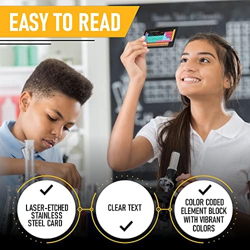 - EASY TO READ: Reading this table of the elements will be a breeze with the front table and element table reference guide in the back. Each card has been laser-etched onto matt black stainless steel for a premium feel. Text is clear, and each element block is color coded with vibrant colors to help distinguish between elements and metal categories.