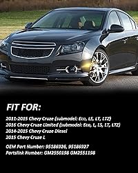 - Full LED Side Marker Light Kit Replacement for Chevy 2011-2015. Designed to upgrade your vehicle’s original look, help signal your intent to turn or change lanes. Elaborately fabricated to strict factory specifications, and Ensure to deliver dependable, smooth operation.FEATURE: * 5X Brighter than OEM Bulb * Plug and play. Canbus LED control unit design, no error code.* DOT, SAE, compliant. Meets on-road use regulations* Unique smoke-out Look. PC/ABS lens and housing processed without scratch, no faded with long-time exposureSPECIFICATION: * Placement on Vehicle: Front bumper side marker* Housing Color: Clear Lens* Lens: ABS Plastic Lens* LED Color: Amber* Waterproof grade: IP67* Service life: More than 50000 hoursFITMENT:2011-2015 Chevy Cruze (submodel: Eco, LS, LT, LTZ)2016 Chevy Cruze Limited (submodel: Eco, L, LS, LT, LTZ)2014-2015 Chevy Cruze Diesel2015 Chevy Cruze LOEM NUMBER:* Right: 42334145, GM2551198* Left: 42334144, GM2550198IN THE PACKAGE:* Front Side Marker Lamps x2 (Left + Right)