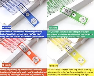 - Features: 48 microscope prepared slides of entomology, botany and mammology specimens for kids, entry-level students or home school programs The slides are made of plastics without sharp edges and are safe for kids Selected fine specimens from various categories, colored labels enable an easy classification For some slides (like insects ...), stereo microscopes with top and bottom lights instead of compound microscopes give the best microscopy images. In red color box, you can find butterfly wing, butterfly antenna, butterfly leg, locust wing, locust antenna, locust leg, dragonfly wing, dragonfly abdomen, dragonfly leg, honeybee wing, honeybee antenna and honeybee leg. In green color box, you will see celery leaf, corn stem, lotus root, cabbage leaf, pumpkin ovary, ginger root, onion epidermis, burdock root, carrot root, cucumber ovary, sponge gourd stem and potato starch. In yellow color box, there are dandelion fuzz, carnation stem, tulip pollen, laver, lily pollen, camellia pollen, sunflower pollen, bamboo cane, phlox leaf, pine tree stem, veins of holy leaf and agar. In blue color box, there exist goldfish scale, sardine scale, plankton egg, canary feather, rabbit hair, cat hair, horse hair, cow hair, sheep hair, fowl feather, duck feather and pigeon feather. Specifications: Material: Plastic Color: Red, Blue, Yellow, Green Size: 60x20x1mm/2.36x0.79x0.39" Quantity: 12 Pcs/1 Set