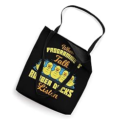 When Programmers Talk Rubber Ducks Listen - Funny joke for computer geeks & nerds. In software engineering, rubber duck debugging is a method of debugging code. Software-developers explain the source-code to a rubber duck to find a bug in the code. Don't despair when your program has an error. Take a rubber duck & this shirt and start explaining and describing. You will find the source of error very fast and then you can start testing your computer program again. Gift for a computer science graduate. 16” x 16” bag with two 14” long and 1” wide black cotton webbing strap handles. Made of a lightweight, spun polyester canvas-like fabric. All seams and stress points are double-stitched for durability, and the reinforced bottom flattens to fit more items and hold larger objects. Spot clean/dry clean only.