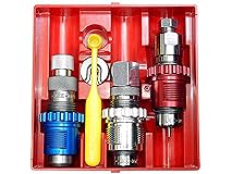 9Mm Luger Breech Lock 3-Die set Includes colored Smart Lock bushings for easy die identification Includes Carbide Full Length Sizing Die, Bullet Seating Die, Powder Thru Expanding Die Comes with Universal Shell Holder, Powder Dipper and Instructions/Load Data Durable and long lasting