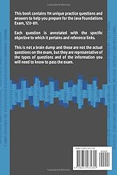 - This book contains 114 unique practice questions and answers to help you prepare for the Java Foundations Exam, 1Z0-811.Each question is annotated with the specific objective to which it pertains and reference links.This is not a brain dump and these are not the actual questions on the exam, but they are representative of the types of questions and of the information you will need to know to pass the exam.The practice test contains questions based on the following exam objectives:What Is Java?Describe the features of JavaDescribe the real-world applications of JavaJava BasicsDescribe the Java Development Kit (JDK) and the Java Runtime Environment (JRE)Describe the components of object-oriented programmingDescribe the components of a basic Java programCompile and execute a Java programBasic Java ElementsIdentify the conventions to be followed in a Java programUse Java reserved wordsUse single-line and multi-line comments in Java programsImport other Java packages to make them accessible in your codeDescribe the java.lang packageWorking with Java Data TypesDeclare and initialize variables including a variable using finalCast a value from one data type to another including automatic and manual promotionDeclare and initialize a String variableWorking with Java OperatorsUse basic arithmetic operators to manipulate data including +, -, *, /, and %Use the increment and decrement operatorsUse relational operators including ==, !=, >, >=, <, and <=Use arithmetic assignment operatorsUse conditional operators including &&, , and ?Describe the operator precedence and use of parenthesisWorking with the String ClassDevelop code that uses methods from the String classFormat Strings using escape sequences including %d, %n, and %sWorking with the Random and Math ClassesUse the Random classUse the Math classUsing Decision StatementsUse the decision making statement (if-then and if-then-else)Use the switch statementCompare how == differs between primitives and objectsCompare two String objects by using the compareTo and equals methodsUsing Looping StatementsDescribe looping statementsUse a for loop including an enhanced for loopUse a while loopUse a do-while loopCompare and contrast the for, while, and do-while loopsDevelop code that uses break and continue statementsDebugging and Exception HandlingIdentify syntax and logic errorsUse exception handlingHandle common exceptions thrownUse try and catch blocksArrays and ArrayListsUse a one-dimensional arrayCreate and manipulate an ArrayListTraverse the elements of an ArrayList by using iterators and loops including the enhanced for loopCompare an array and an ArrayListClasses and ConstructorsCreate a new class including a main methodUse the private modifierDescribe the relationship between an object and its membersDescribe the difference between a class variable, an instance variable, and a local variableDevelop code that creates an object's default constructor and modifies the object's fieldsUse constructors with and without parametersDevelop code that overloads constructorsJava MethodsDescribe and create a methodCreate and use accessor and mutator methodsCreate overloaded methodsDescribe a static method and demonstrate its use within a program