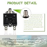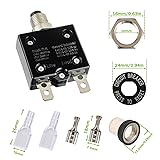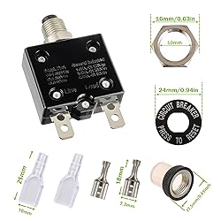 - EPLZON 8A Manual Reset Push Button Circuit Breaker with Quick Connect Terminals and Waterproof Button Caps Assortment Kit ⭕How it works: This switch can be reset after being disconnected for a period of time, and then press the reset switch again to use it again. When the load exceeds the rated current, the switch reset button will automatically cut off the circuit, thus protecting the circuit. Specification: 🔹Shell material: plastic, high mechanical performance, good insulation; metal sheet, good stability 🔸Colour: Black 🔹Dimensions: 56 x 31 x 14 mm / 2.2 x 1.22 x 0.55" 🔸Current: 8A 🔹Rated voltage DC50V, AC125-250V 🔸Reset type: manual reset 🔹Operating temperature: -10℃ to ~ 60℃/ 14℉ to 140℉ 🔸Interruption Capacity: 1000 Amps 🔹Installs in 3/8" (10mm) round hole Package Contents: 2 pcs x push-button thermal breakers 2 pcs × Waterproof Button Caps 2 pcs x spacers 2 pcs x Hex Nuts 4 pcs × 6.3MM Female Spade Terminals 4 pcs × 6.3MM insulating sleeve