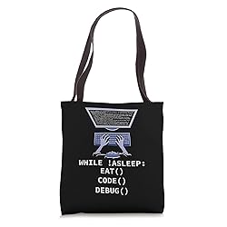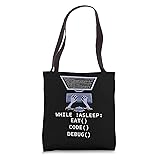 While !asleep: eat() code() debug() 16” x 16” bag with two 14” long and 1” wide black cotton webbing strap handles. Made of a lightweight, spun polyester canvas-like fabric. All seams and stress points are double-stitched for durability, and the reinforced bottom flattens to fit more items and hold larger objects. Spot clean/dry clean only.