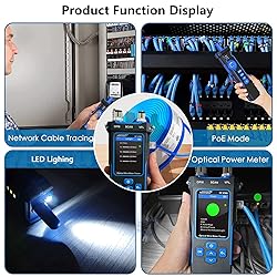 【9functions of network cable tester】: NF-8508 (transmitter) continuity test, cable scan, port flicker, cable length measurement, PoE test, crystal head QC test, OPM (optical power meter) and VFL (visual fault location) NVC function 【POE Test】: 8 core automatic identification of the middle span / end span / power, automatic identification of standard and non-standard equipment, optical power meter: 850 / 1300 / 1310 / 1490 / 1550 / 1625nm, seven standard wavelength switch; unit switch for dBm, dB or mw, uw, nw; and REF switch, -70 ~ +10 【Cable Length Test】: can measure the range of 200 meters, network cables, telephone lines and BNC cables, with visual fault location function, detect and locate fiber breaks, and poor connections, fiber bends or cracks, and other problems 【CAT5 CAT6 Cable Toner】: (receiver) sensitivity adjustment, 300m null shielded network cable/non-null shielded network cable, NCV detection, lighting function, etc. Non-contact voltage detection: the receiver can be used to detect the AC voltage of household wires 【RJ45 RJ11 cable tester】: cable tracking, wire locator and tests the faults ofLAN cable tester, for telecommunications, computers, engineering wiring, networking and home essential network tools