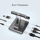 Unique Design– This integrated USB-C docking station combined design frees your hands and quickly expands more possibilities for working and gaming. The sleek design of the docking station and a decrease of wires on your desk creates a more efficient and neat workspace to help increase your productivity. 8 in 1 USB-C Dock– This USB C hub for iPad Pro is equipped with HDMI 2.0 port, two USB Type-A 5Gbps ports, SD / microSD 3.0 card reader, audio/mic combo jack and PD 100W pass-through charging, giving you the connections you need for increased productivity. No need to install any drivers. Elevates your view– raises your iPad or USB-C device to an optimal viewing angle, perfect for taking your video conference call or free your hand when doing any tutorial class – complete with protective padding to help guard your device against scratches. Compact Size– The stand is foldable and rotatable to adjust the angle of the view. The compact size helps to get rid of the troubles of the wires, Space-saving size and protective drawstring bag perfect for your on-the-go. Wide Compatibility– The integrated USB-C docking station is designed for any host device that has a full-featured USB C port, make sure your device USB-C port. When you use the stand to hold your tablet or heavy devices, please be careful to adjust to the optimal angle to make sure it won't collapse.