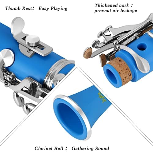 - Unique Appearance Design: Clarinets supported by ABS is not easy to wear and tear, just wipe it gently with a cleaning cloth after each use. Bb clarinet has Nickel-plated keys, which have stronger air tightness and a more stable sound. High-quality blue body with durable nickel-plated clarinete. The memory pin spring is made of NAS high-carbon steel, with fast response speed, good elasticity and not easy to deform