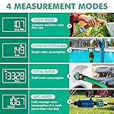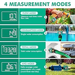 Pure Brass Inlet & Metal Thread: Durable heavy-duty brass construction ensures exceptional durability and effortless installation or removal. Equipped with an easy-to-read LCD screen and one-touch control push button, this water flow meter can easily display and track the water usage & flow rate of your outdoor garden hose with 4 different measurement modes. Short press the button to change the mode: Flow Mode: real-time water flow rate; Consumption Mode: last-time water usage; Average Mode: daily average water usage of a week (count from next day); Total Mode: total water usage. Long press the button at flow mode to switch the unit (US gallon to liter). Reset data when long press the button at other modes. The LCD screen goes to sleep automatically if there is no operation in 1 minute. Built-in with hall type sensor and IC chipset, which provide more accurate measurement and precise calculations. Ideal to measure how much amount of water are used and prevent over-watering. Rugged design with premium heavy duty ABS material, this water meter is weatherproof and durable, great to resist UV, sunshine, and rain. The IPX6 waterproof grade ensures more stability for outdoor use. The measurable water flow rate ranges from 0.3 to 12 GPM (1 to 45.5 LPM). For optimal meter reading, we recommend adjusting the faucet to a moderate flow rate; it is not necessary to turn it to the maximum setting.