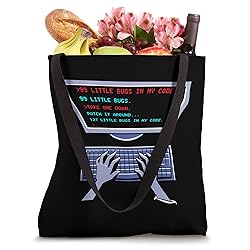 99 Little Bugs In My Code 99 Little Bugs Take One Down Patch It Around 127 Little Bugs In My Code - perfect information technology artwork for any nerd who loves software. This coding design is ideal for every geek who thinks about syntax. 16” x 16” bag with two 14” long and 1” wide black cotton webbing strap handles. Made of a lightweight, spun polyester canvas-like fabric. All seams and stress points are double-stitched for durability, and the reinforced bottom flattens to fit more items and hold larger objects. Spot clean/dry clean only.