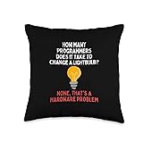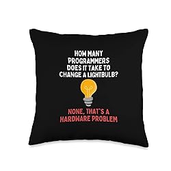 How many programmers does it take to change a lightbulb? None, that's a hardware problem! This joke is perfect for the programming or programming engineer. 100% spun-polyester fabric Double-sided print Filled with 100% polyester and sewn closed Individually cut and sewn by hand Spot clean/dry clean only