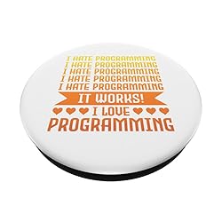 I Hate Programming. I Hate Programming. I Hate Programming. Oh Wait, It Works. I Love Programming. Perfect saying for Coder, Programmer or Software Developer. Perfect quote for Computer Nerds and Geeks who work in the IT department. If you love technology, program and love the binary code, and also consider yourself a Nerd or a Geek, this design is perfect for you. Use it every day at school, at university or at work. For IT Professional who love coding. Yellow orange colored. PopGrip with swappable top; switch out your PopTop for another design or remove it completely for wireless charging capabilities. (Not compatible with Apple MagSafe wireless charger or MagSafe wallet.) Expandable stand to watch videos, take group photos, FaceTime, and Skype handsfree. Advanced adhesive allows you to remove and reposition on most devices and cases. Note: Will not stick to some silicone, waterproof, or highly textured cases. Works best with smooth, hard plastic cases. Will adhere to iPhone 11, but not to the iPhone 11 Pro nor the iPhone 11 ProMax without a suitable case.