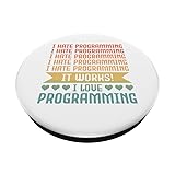 I Hate Programming. I Hate Programming. I Hate Programming. Oh Wait, It Works. I Love Programming. Perfect saying for Coder, Programmer or Software Developer. Perfect quote for Computer Nerds and Geeks who work in the IT department. If you love technology, program and love the binary code, and also consider yourself a Nerd or a Geek, this design is perfect for you. Use it every day at school, at university or at work. For IT Professional who love coding. Retro style vintage colors PopGrip with swappable top; switch out your PopTop for another design or remove it completely for wireless charging capabilities. (Not compatible with Apple MagSafe wireless charger or MagSafe wallet.) Expandable stand to watch videos, take group photos, FaceTime, and Skype handsfree. Advanced adhesive allows you to remove and reposition on most devices and cases. Note: Will not stick to some silicone, waterproof, or highly textured cases. Works best with smooth, hard plastic cases. Will adhere to iPhone 11, but not to the iPhone 11 Pro nor the iPhone 11 ProMax without a suitable case.