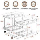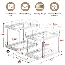 Under Sink Organizers Under Sink Organizer Available in 2 Different Sizes: The smaller size (S) measures 8.27" x 13.19" x 9.06", and the larger size (L) measures 8.27" x 13.19" x 10.63". High-Low combos make this bathroom organizer versatile for multi-purpose storage and organization, such as kitchen organization, cabinet organizer and storage, bathroom organizer countertop, pantry organizer, under sink organizer, etc Pull-Out Drawers and Divider: This kitchen organization and storage set come with 4 slide-out drawers and 8 movable dividers. Each drawer can slide in and out smoothly, making it a breeze to access hard-to-reach things. The movable divider allows you to freely adjust the spacing as you like to organize your meds, cosmetics, stationery, skincare, perfume, brushes, etc Upgraded Clear Acrylic Organizers: The kitchen cabinet organizer are Selected with high-end acrylic, aluminum alloy support rod, etc high-quality materials to Produce, so you can see the inside clearly and find the wanted stuff fast, An essential assistant for bathroom organization, and kitchen organizer and pantry storage, keeping toiletries and kitchen seasoning organized Stackable Pantry Storage Organizer: What sets this pull out cabinet organizer apart is that you can stack 3 at a time according to space needs, which means it is a must-have space saver! it is very useful for organizing to hold spice jars, medicines bottles, beverages, canned goods, grab-and-go snacks, and even a variety of health/beauty aides, and small items Anti-slip Durable and Convenient: We provide non-slip silicone stoppers at every base to prevent the bathroom countertop organizer from moving around, even when pulling out a drawer. The 8 support rods are made of rust-proof and durable aluminum alloy for long-lasting use. Assembly is easy - simply connect the bottom base and upper drawers with the 4 rods