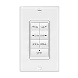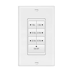 - This 7 Button Timer control replaces a conventional wall switch for energy saving and convenience. You manually turn the lights or fan on and the lights or fan turn off automatically after a pre-set period of time ranging from 1-60 minutes. This 2-pack of in-wall countdown switches features 7 buttons for on/off, 1 min, 5 mins, 10 mins, 20 mins, 30 mins and 60 mins. The indicator light on the button that was pressed will stay on. Ten seconds before the time expires, the indicator light will flash as an indicator that it is about to time out. If you need the output to stay on longer, you can press the time button again, and the output can run for the same length of time again. After the output turns off, the indicator light on the ON/OFF button will turn off. You can also set this switch to constant on mode by holding the ON/OFF button for more than 5 seconds. During constant on mode, all LED indicators are unlit. The output will now stay on until you turn it off manually by simply pressing the ON/OFF button once.This device is made for indoor use only and includes the wall plate. It’s perfect for bathroom exhaust fans as well as heaters, sprinklers, laundry rooms and lights. Should the switch get placed in constant on mode, you can easily take it out of constant on mode by pressing the On/Off button. More details are available in the included instruction manual. This item is UL Listed and backed by Maxxima for 1 year.