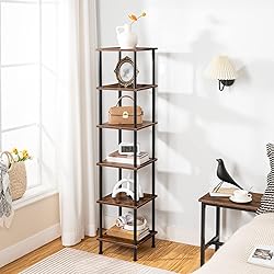No Tool Required: Clear instructions and labeled parts included. You just need to twist in the components with your hands and finish the assembly of this standing corner shelf without additional tools, simple and relaxing Large Capacity Storage: This 6-tier corner bookcase has a 11.8"L x 11.8"W space for each level with a 9.6" spacing and it is designed to hold and display your greenery, decorations, collections, magazines in any unused corners, functional and beautiful Multi-Purpose Application: It can be a corner bookcase or a storage shelves used in your living room, balcony to organize trivial things and show your taste. You can DIY the shelves from 2 to 5 layers or purchase more to customize your life Firm and Stable: The small corner shelf adopts quality particleboard and metal, featuring reliability, each tier bearing up to 22 lb. Four adjustable feet keep the bookshelf stable without scratches on the floor and the anti-tip kit offers more protection Retro Style: The classic combination of rustic brown and black showcases the sense of luxury in a low profile. The unique wood grain finish and metal element collide to manifest the industrial style, stylish and all-match