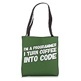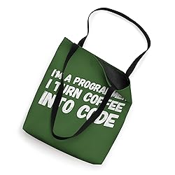 Great present for any family member or friend that would enjoy this type of design! Funny Computer Programmer Turn Coffee Into Code Engineer Funny Computer Programmer Turn Coffee Into Code Engineer 16” x 16” bag with two 14” long and 1” wide black cotton webbing strap handles. Made of a lightweight, spun polyester canvas-like fabric. All seams and stress points are double-stitched for durability, and the reinforced bottom flattens to fit more items and hold larger objects. Spot clean/dry clean only.