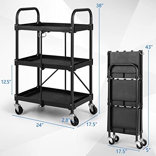 - 【Smart Side Trays】This foldable utility cart is designed with 3 layer shelves (24” x 17.5”), offering ample space for different items. Furthermore, each tier is designed with 4 small open compartments, which can well organize tiny loose items. (Each tier is 12.5 inches apart)