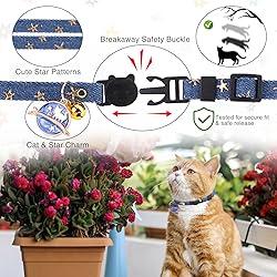 - 3 PACK: This cat collar contains three different colored cat collars and are available in a variety of styles- such as 3pcs cute animal pattern cat collars, 3pcs fruit kitty collars, 3pcs litter flower kitten collars, 3pcs daisy charms cat collars, 3pcs denim moon and star cat collars, and so on! Suitable for every season, especially spring and summer, ideal for your pets to wear on most occasions, such as daily walking, traveling, accessorie for your cutest furry friend or family with 2 cats. - REMOVABLE BELLS AND CHARMS: The adorable cat bell collar comes with removable matching bells and charms to add elegance and cuteness to your pet. In addition, the bell will help you identify your cat's location more easily and keep them safe. - SAFETY DESIGN: Our kitten collars are equipped with a safety breakaway buckle that automatically releases when the collar is subjected to a certain amount of pressure, preventing strangulation and ensuring pets are safe and secure when out and about. - ADJUSTABLE SIZE: The cat collars for boy and girl cats have an adjustment range of 8"-12" and is 3/8" width. Simple design and adjustable size for most sizes and breeds of cats. Be sure to measure your pet's neck circumference before purchasing to ensure you choose the right size to provide the best wearing experience for your furry friend. - COMFORTABLE AND DURABLE: These super cute cat collars are made from high quality fabric and delicately handcrafted to ensure durability and comfort. What's more, you can easily hand wash and air dry at a low temperature to keep your pet cat collar fresh at all times.