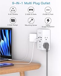 【9-in-1 Multi Plug Outlet with Widely Space】 Unique 3 Side Design Power Strip with 5 AC outlets (1875W) and 4 USB ports(3.1A Total); One Beat outlet splitter with 2.1 inches long space in between, can charge 5 big plug at the same time without blocking. With built-in 1800 Joules surge protector that meets most of your needs in life, allowing multiple devices to be charged simultaneously. 【2 USB-C & 2 USB- A Smart Charge】This wall outlet extender with 2 USB C ports and 2 USB A outlet, each USB C charging port features 5V/3A MAX. USB A port features 5V/2.4A Max output. The total output of 4 USB ports is 5V/3.1A. NOTE: The USB-C port doesn't support Macbook, Macbook Air, Macbook Pro or any other laptops which needs 9~22V charging voltage. 【1800J Surge Protector Outlet】With a built-in 1800J surge protector, our electrical outlet extender with 3 complementary Surge Protection Circuits, TVS(transient voltage suppressor) MOV(metal oxide varistor) GDT(gas discharge tube) combined with fire-resistant casing(fire-resistant 1382℉)- keeping you and your devices completely safe. LED indicator light on to show your devices are protected. 【Wall Mountable Design】Just plug the surge protector into a standard grounded duplex wall receptacle and décor outlet. If you want secure it on duplex outlet just need a screw driver to use the screw included then you don't need worry about falling off. Note: this works on duplex outlet only, other types of outlet like GFCI outlet cannot be secured onto the wall. This Multiple plug outlet is perfect for bedroom, bathroom, kitchen, hotel and college dorm room usage. 【Multi Safety Protection】: Certified by ETL, ROHS and FCC. Wall outlet expander prevent your electric devices from over-current/ over-charge/ short circuit/ over-heated. You can purchase with confidence, with One Beat 30-day return and 12-month replacement.