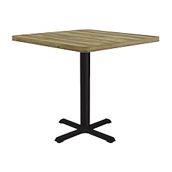SIZE: Café Table Size is 30" square, 29" high, built for commercial use TOP: 1-1/4" Colonial Hickory laminate top with backer sheet to prevent warping, with matching edge band DURABLE: Commercial high pressure laminate top resists scratch's, paint, markers, crayons, food and stains and is the same durable material used for kitchen countertops Textured black cast iron X-Base and top spider with 3" diameter steel columns make this table strong and durable, nylon leveling guides for easy leveling and sturdy placement Table Tops are made in the USA, bases and columns are imported