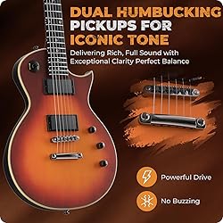 VINTAGE STYLE WITH MODERN COMFORT:The Fesley Electric Guitar Kit combines a contoured body with a vintage matte finish, delivering classic looks, excellent sustain, and aggressive tone, all while ensuring comfortable playability. SOLID MAHOGANY NECK WITH MODERN "D" PROFILE: Features a solid mahogany neck paired with a smooth purpleheart fingerboard, delivering exceptional note clarity and a snappy, responsive touch for both fingerstyle and plectrum playing. The modern "D"-shaped profile offers speed-friendly agility, making it a perfect fit for players of all styles. PRECISION AND PLAYABILITY: The Fesley electric guitar offers a 24.75-inch scale length with a 1.69-inch plastic steel nut for precise intonation and ideal string spacing. Its 22 jumbo frets ensure smooth transitions across the fretboard, delivering enhanced playability for both beginners and experienced players. PREMIUM POPLAR BODY WITH EPOXY FINISH: Crafted from high-quality poplar, this solid-body electric guitar delivers vibrant tones with lasting sustain. The durable epoxy resin finish adds a sleek, protective layer, ensuring both superior sound and long-lasting performance. EXCEPTIONAL PAF-STYLE FIDELITY: Experience the warmth and versatility of dual humbucker pickups, delivering smooth lows, complex mids, and sweet highs. Perfect for both clean and overdriven tones, the 3-way toggle switch and three control knobs (two volume, one tone) provide precise sound control for any playing style. PREMIUM GUITAR ACCESSORIES: This electric guitar set includes everything you need to start playing right away: an LP guitar, a gig bag, a connection cable, a strap, a user manual, a sanding block for fret polishing, and a set of guitar picks. Perfect for all skill levels and occasions, this kit is an ideal choice for beginners and adult learners alike. Get ready to unleash your musical potential! PEACE OF MIND PURCHASE: Fesley offers electric guitars with a 1-Year Assurance for your peace of mind. We also provide 24-hour customer support to assist you with any questions you may have. Whether you need help with aftermarket inquiries or music theory, we're here to support your musical journey. We believe every note enhances your experience, ensuring you enjoy every moment with our electric guitars.