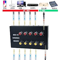 1/8" 3.5mm stereo 10 in mixing 2 out power supply 12v ≥1000mA Used for extending control of tuning, mixing instruments, CD players, t 10 channels+2 channel output have independent volume knob control The sound extractor input interface is compatible with PCs, mobile phones, laptops, and more. The output is compatible with speakers, headphones, bar speakers, etc. Not a professional microphone mixer, only compatible with a small number of mics