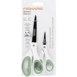 HOME & OFFICE STAPLE: Fiskars Everyday Non-stick Titanium Scissors with SoftGrip are ideal for cutting a wide variety of materials including paper, cardboard, tape, glue and more PRECISION ART SUPPLIES: Stainless steel blades make clean cuts and hold their sharp edge for long-lasting performance LONG LASTING AND RELIABLE: Titanium blade coating is 3x harder than steel COMFORTABLE AND CONVENIENT: SoftGrip provides added comfort and control and a Non-Stick blade coating prevents blades from gumming up and glides through sticky materials QUALITY TOOLS FOR ARTS AND CRAFTS: From scissors & cutting mats, rotary & paper cutters, to classroom essentials, scissors for kids, and quilting & scrapbooking supplies, Fiskars crafting tools are designed to help you express yourself INCLUDES: (1) Fiskars 8" Scissors for general home and office use and (1) Fiskars 5" Scissors for making detailed cuts; lifetime warranty