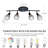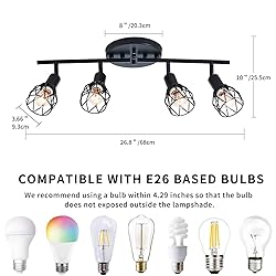 【INDUSTRIAL AND VINTAGE STYLE】Crafted with premium iron, this industrial flush mount ceiling light has 4 open metal wire shades, each caging a bulb, forming a simple architectural shape that brightens your space with an airy industrial ambiance. Gorgeous brightness and charming lights bring warmth to your home 【ADJUSTABLE TRACK HEADS】4 independently adjustable track heads can rotate 180-degrees; kitchen light fixtures are ideal for adding art to your kitchen island, foyers, restaurants or living rooms, bedrooms, hallways, stairs, garage, laundry room or any other place 【BULB REQUIREMENT】Features 4 heat-resistant standard E26 ceramics bulb socket (BULB NOT INCLUDED); Specifically compatible with LED, incandescent, CFL, halogen; And it also compatible with dimmer, you can use dimmable bulb to create a warm and relaxed atmosphere (Dimmer switch should buy separately) 【EASY TO INSTAL】The package contains a quick installation guide to help you install easily; This track light is hardwired installation required; The metal wire shades are NOT enclosed and the bulb could be installed into the lamp base from its bottom; Includes all mounting hardware for quick and easy installation 【CUSTOMER SATISFACTION】We will give you 100% satisfaction; If you have any other problem about the item, please email to us first for further assistance, we must reply you within 24 hours; Please do not worry, we are always here responsible to help you resolve the concerned issue
