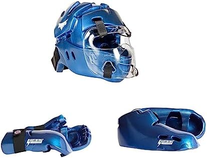 - ProForce Lighting 5 Piece Sparring Gear Combo Set in Blue with full head gear and mask. Foam dipped gear for martial arts, karate and taekwondo. Set include Kicks, Gloves, Head gear and Mouth Piece you pick your shoes size and head size and we will match the gloves to the size you choose.