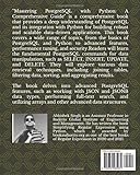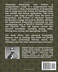 - "Mastering PostgreSQL with Python: A Comprehensive Guide" is a comprehensive book that provides a deep understanding of PostgreSQL and its integration with Python for building robust and scalable data-driven applications. This book covers a wide range of topics, from the basics of PostgreSQL and Python to advanced features, performance tuning, and security.The book begins with an introduction to relational databases, highlighting the importance of PostgreSQL and Python in modern data-driven applications. It guides readers through the installation and setup process of PostgreSQL and Python, ensuring a smooth development environment.Readers will learn the fundamental PostgreSQL commands for data manipulation, such as SELECT, INSERT, UPDATE, and DELETE. They will explore various data retrieval techniques, including joining tables, filtering data, sorting, and aggregating results.The book delves into advanced PostgreSQL features, such as working with JSON and JSONB data types, performing full-text search, and utilizing arrays and other advanced data structures.Throughout the book, readers will find practical examples, code snippets, and real-world scenarios to reinforce their understanding. The interview questions provided at the end of each chapter serve as valuable resources for job interviews and self-assessment.By the end of "Mastering PostgreSQL with Python," readers will have gained the knowledge and skills necessary to leverage the power of PostgreSQL and Python to build robust and scalable data-driven applications while ensuring high performance, data integrity, and security.
