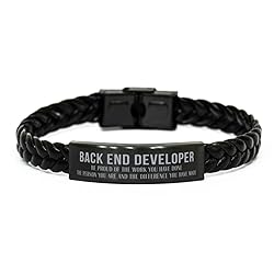 Back End Developer Handmade Unique Braided Leather Bracelet design makes it easy to put on and take off, while ensuring a secure fit. Perfect gifts for Back End Developer on any occasion, including birthdays, anniversaries, graduations, Valentine's Day, Fathers' Day, Thanksgiving, Christmas and more Back End Developer Bracelet Measuring approximately 21 centimeters in length and adjustable, making it suitable for both men and women Durable and high-quality construction ensures long-lasting wear and makes it a cherished accessory for years to come. Sleek and sophisticated black color gives a timeless and versatile look. SHIPPING - Engraved and shipped with love from Georgia, USA.