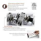 Three Functional Slots: This SHARPAL Electric Knife Sharpener is designed with 3 stages to ensure a razor-sharp edge on most double-beveled straight edge and serrated knives. Simultaneous grinding of both blades saves much time and ensures that both blades are sharpened the same number of times. It provides a professional sharpening experience right in your kitchen. Perfectly preset grinding wheel angles—20-degree: Ideal for a wide range of knives, including both kitchen and outdoor knives. It helps in maintaining the durability of the blade, less prone to chipping and dulling over time. Compared to meticulous precision 15-degree angle, this user-friendly approach simplifies knife maintenance. One-handed operation, Extremely beginner-friendly: With its innovative design, this sharpener can simultaneously sharpen both sides of a double beveled knife edge, making the sharpening process fast, efficient, and requiring no special skills. Whether you're a seasoned chef or a beginner, this sharpener caters to all skill levels. Noise-Slightly Operation: While some electric sharpeners can be loud and disruptive, this SHARPAL Electric Knife Sharpener operates with minimal noise (Noise level even less than 65 dB), allowing you to sharpen your knives without disturbing others in the kitchen. Additionally, it features a built-in mechanism to collect iron filings making cleanup a breeze. Blade-friendly Design: With advanced technology, this sharpener will not de-temper the blade(Overheat Protection), ensuring the longevity and durability of your knives. Rest assured that your cherished knives are in safe during the sharpening process. Removable Magnetic Receptacles for collecting metal fillings, making cleanup a breeze.